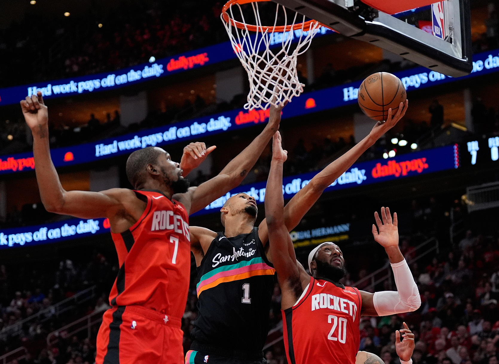 次节开场文班亚马持球突破卡佩拉完成隔扣,阿门完成一个2+1,马刺又利用三分球将分差拉开到16分之多,好在火箭利用快攻再度缩小到10分打停马刺。马刺上半场三分25中11,三分命中率高达44%,罚球更是9中9,而火箭上半场只有5个三分,罚球12中7,上半场打完火箭落后马刺10分之多。